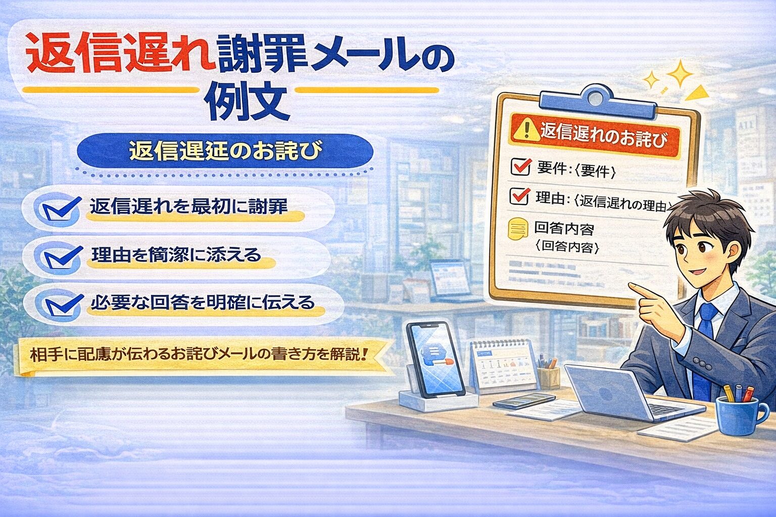 この記事では、返信遅れ謝罪メールの基本構成、相手に配慮が伝わる書き方、実務でそのまま使いやすい例文をまとめて紹介します。
